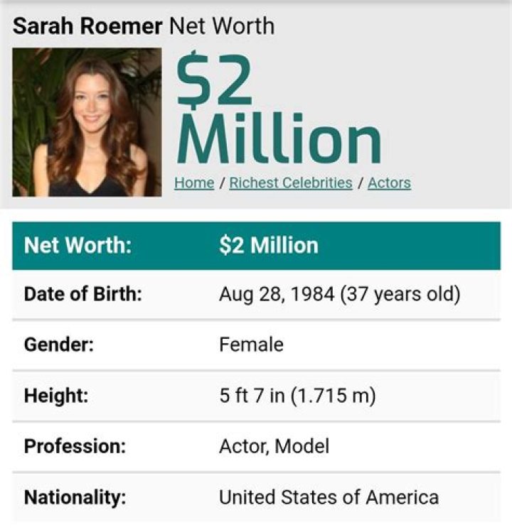 Sarah Roemer is one of the richest Actor from United States. According to our analysis, Wikipedia, Forbes & Business Insider, Sarah Roemer's net worth $5 Million. (Last Update: December 11, 2023)